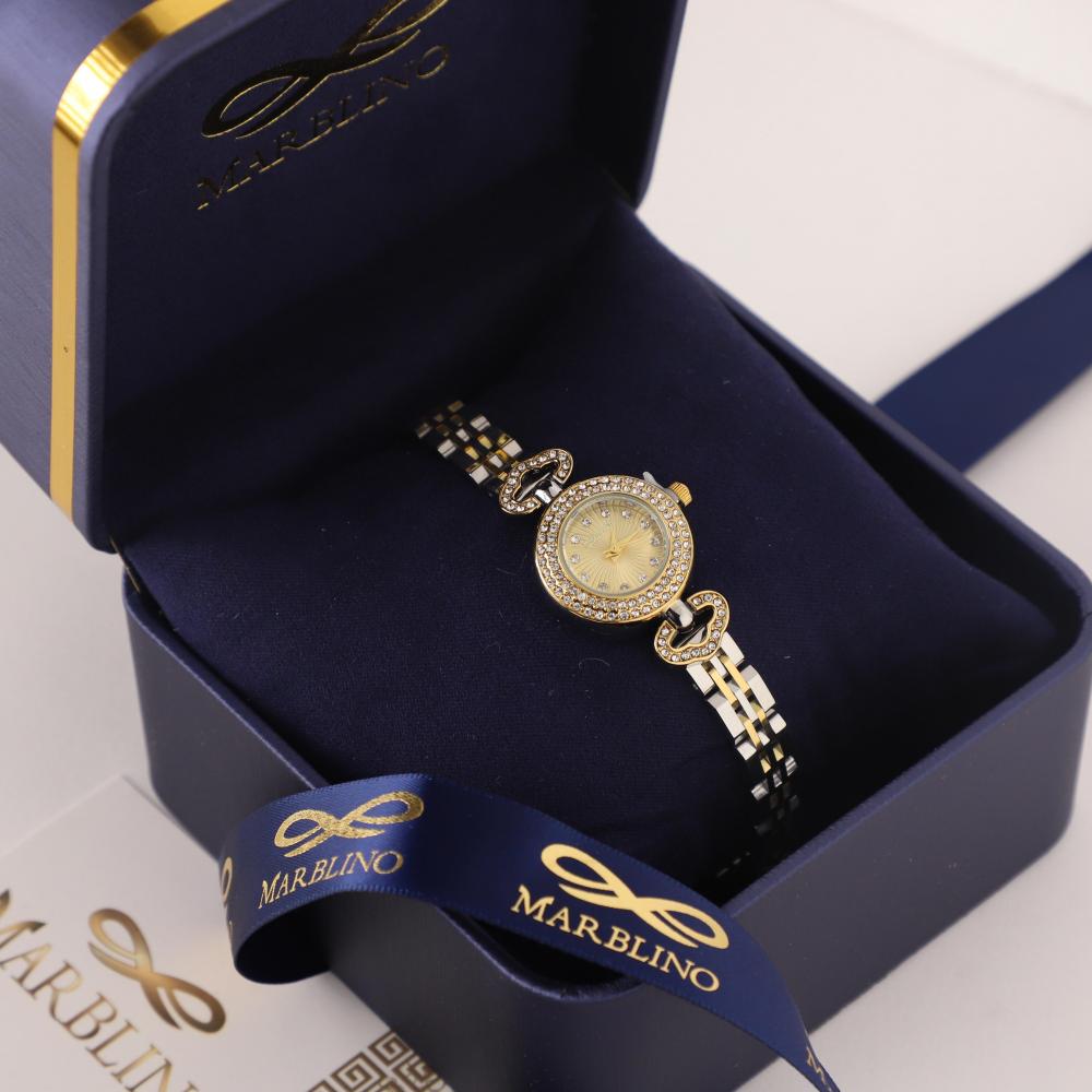 تظهر في الصورة ساعة يد فاخرة بتصميم أنيق وأنثوي، موضوعة داخل علبة فخمة مبطنة من الداخل، تعكس مستوى عاليًا من الرقي والعناية بالتفاصيل. تتميز الساعة بتصميم دائري للقرص، تحيط به دائرة خارجية مرصعة بشكل دقيق بأحجار صغيرة تضيف لمسة من الفخامة والنعومة. المينا الداخلي بسيط وهادئ، يحتوي على مؤشرات ناعمة وخطوط دقيقة تحدد أماكن الساعات، مع عقارب رفيعة مصممة بشكل متناسق وانسيابي لتعكس أناقة التصميم ودقته.