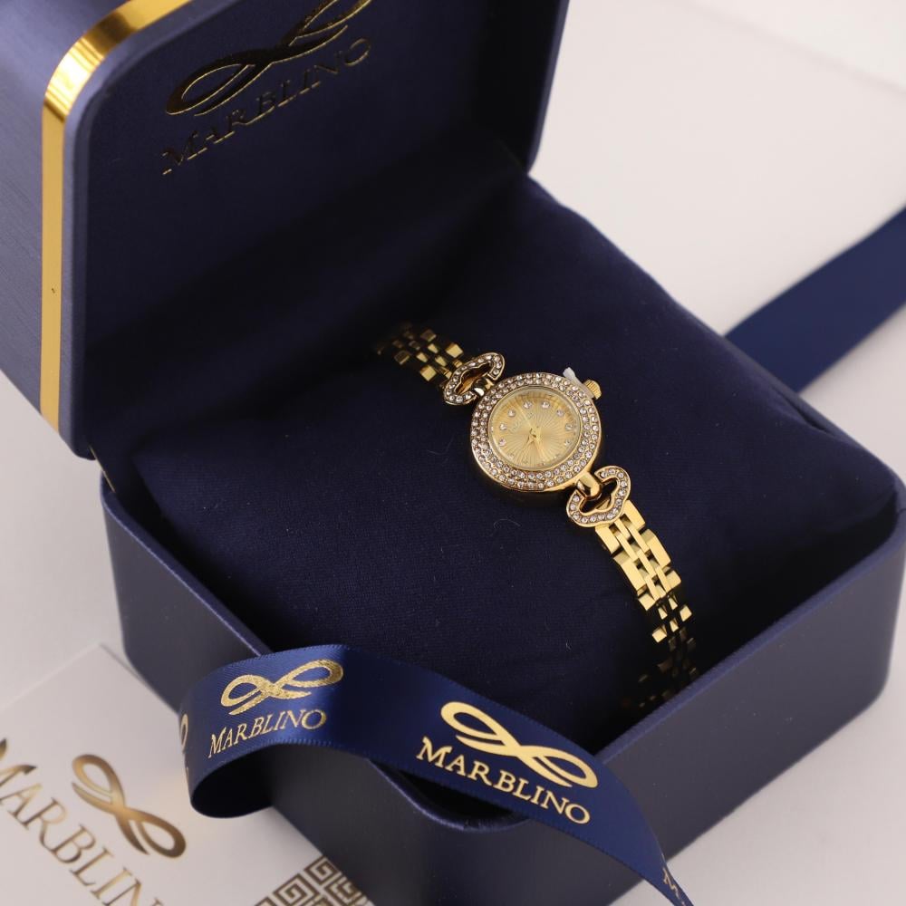 تظهر في الصورة ساعة يد فاخرة بتصميم أنيق وأنثوي، موضوعة داخل علبة فخمة مبطنة من الداخل، تعكس مستوى عاليًا من الرقي والعناية بالتفاصيل. تتميز الساعة بتصميم دائري للقرص، تحيط به دائرة خارجية مرصعة بشكل دقيق بأحجار صغيرة تضيف لمسة من الفخامة والنعومة. المينا الداخلي بسيط وهادئ، يحتوي على مؤشرات ناعمة وخطوط دقيقة تحدد أماكن الساعات، مع عقارب رفيعة مصممة بشكل متناسق وانسيابي لتعكس أناقة التصميم ودقته.