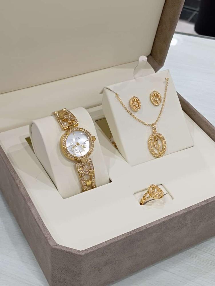 يتميز هذا الطقم بتصميم أنيق يجمع بين الفخامة والتفاصيل العصرية، مما يجعله اختيارًا مثاليًا لمحبي الإكسسوارات الفاخرة والمتناسقة. يحتوي الطقم على ساعة يد بتصميم كلاسيكي مميز، حيث تأتي بمينا دائرية واضحة، مزينة بمؤشرات وأرقام تمنحها طابعًا أنيقًا وسهل القراءة. الإطار مزخرف بزينة براقة تضفي لمسة راقية، بينما يتميز السوار بتصميم متقن يجمع بين النقوش الدقيقة والتفاصيل الجمالية التي تعزز من جاذبيته.