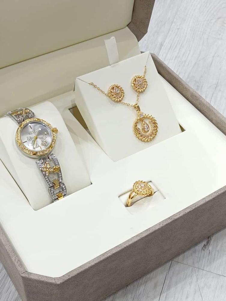 إلى جانب الساعة، يضم الطقم عقدًا أنيقًا بسلسلة رفيعة تحمل تعليقة مزخرفة بشكل هندسي متناسق، تضفي لمسة من الجمال والرقي على الإطلالة. كما يرافق العقد زوج من الأقراط المتناسقة مع تصميم التعليقة، ما يجعل الطقم متكاملاً من حيث الشكل والأسلوب، مما يضفي على من ترتديه لمسة أنثوية جذابة.